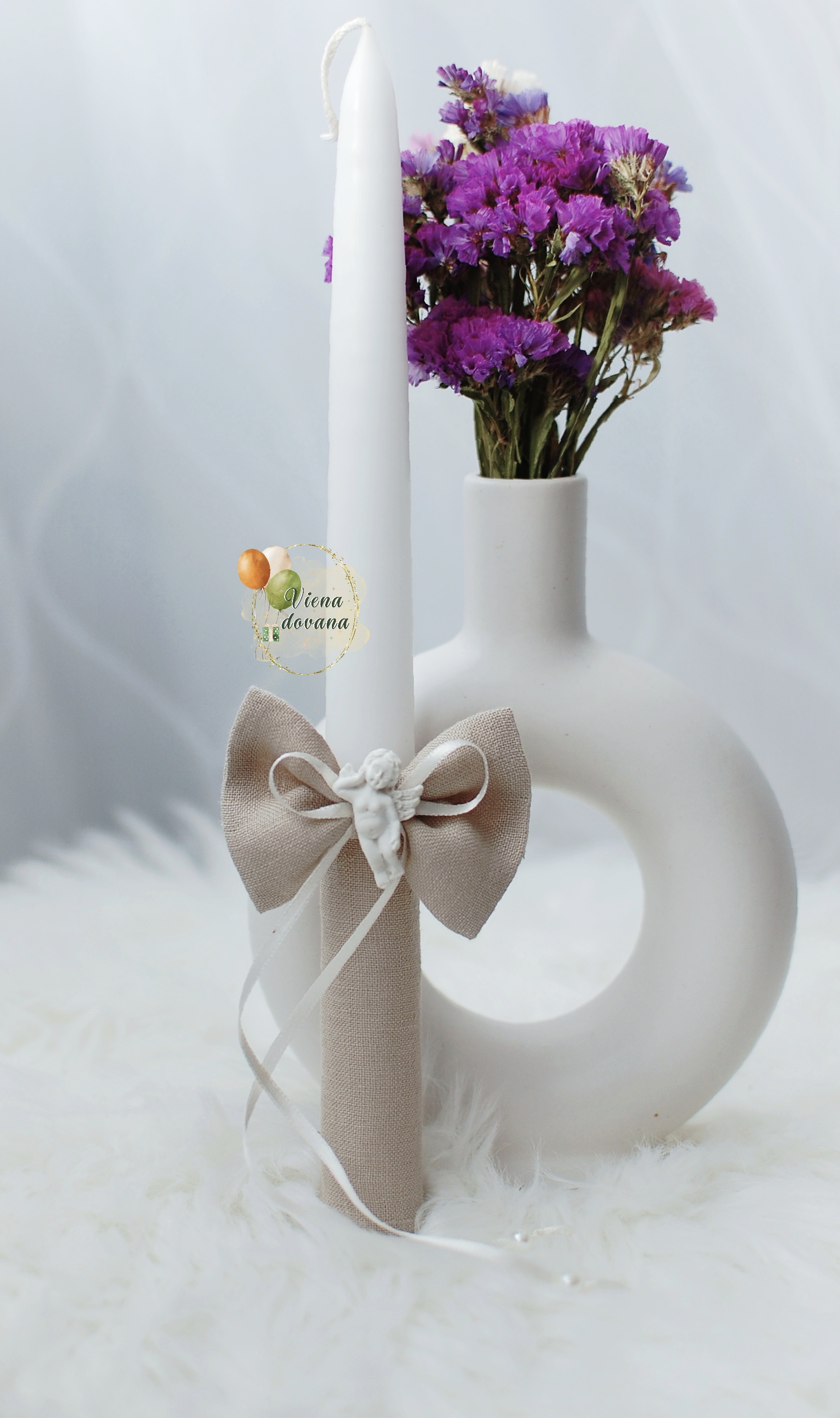 - Žvakė dekoruota natūralaus lino audiniu. (natūrali rusvai pilka spalva)