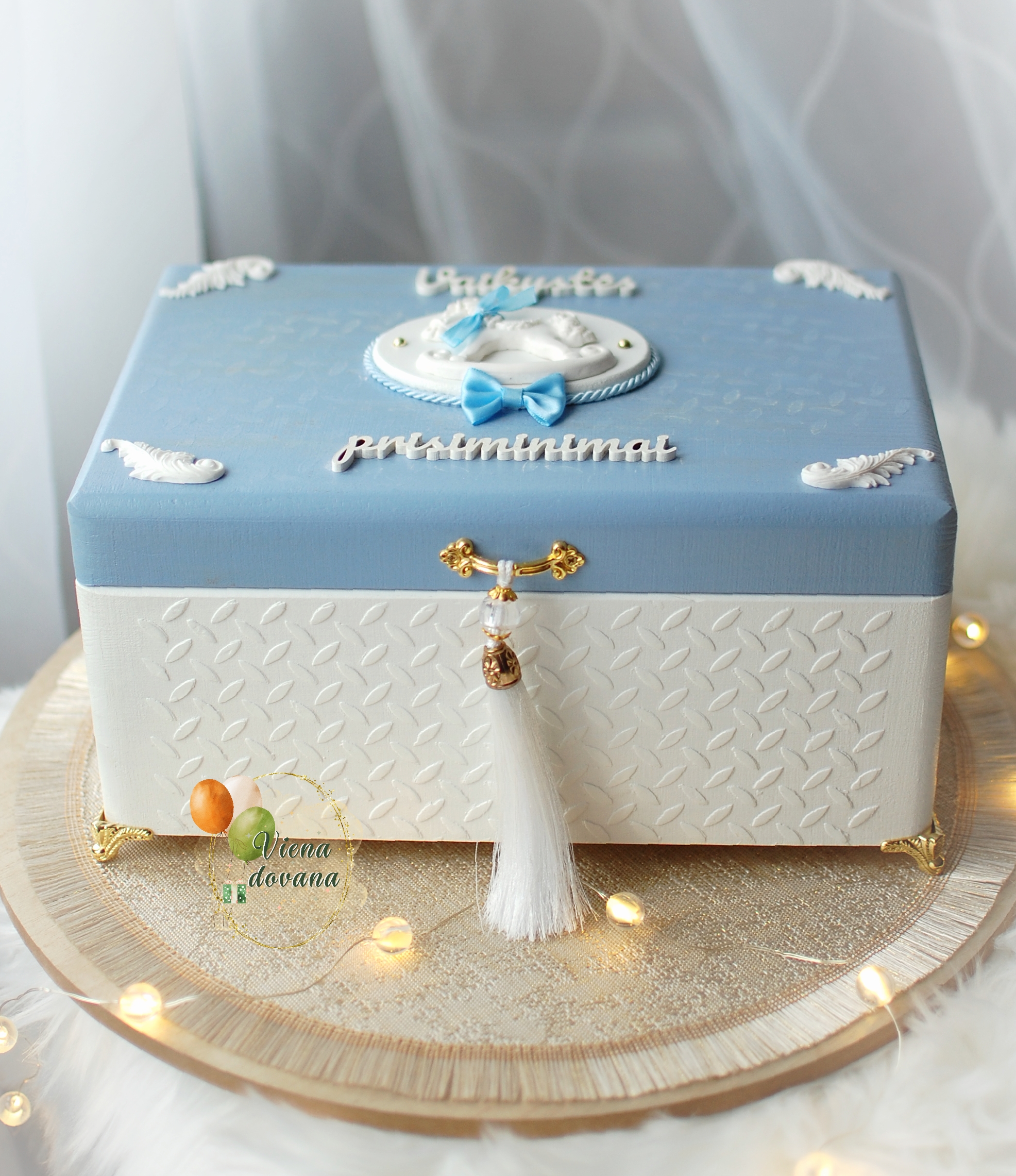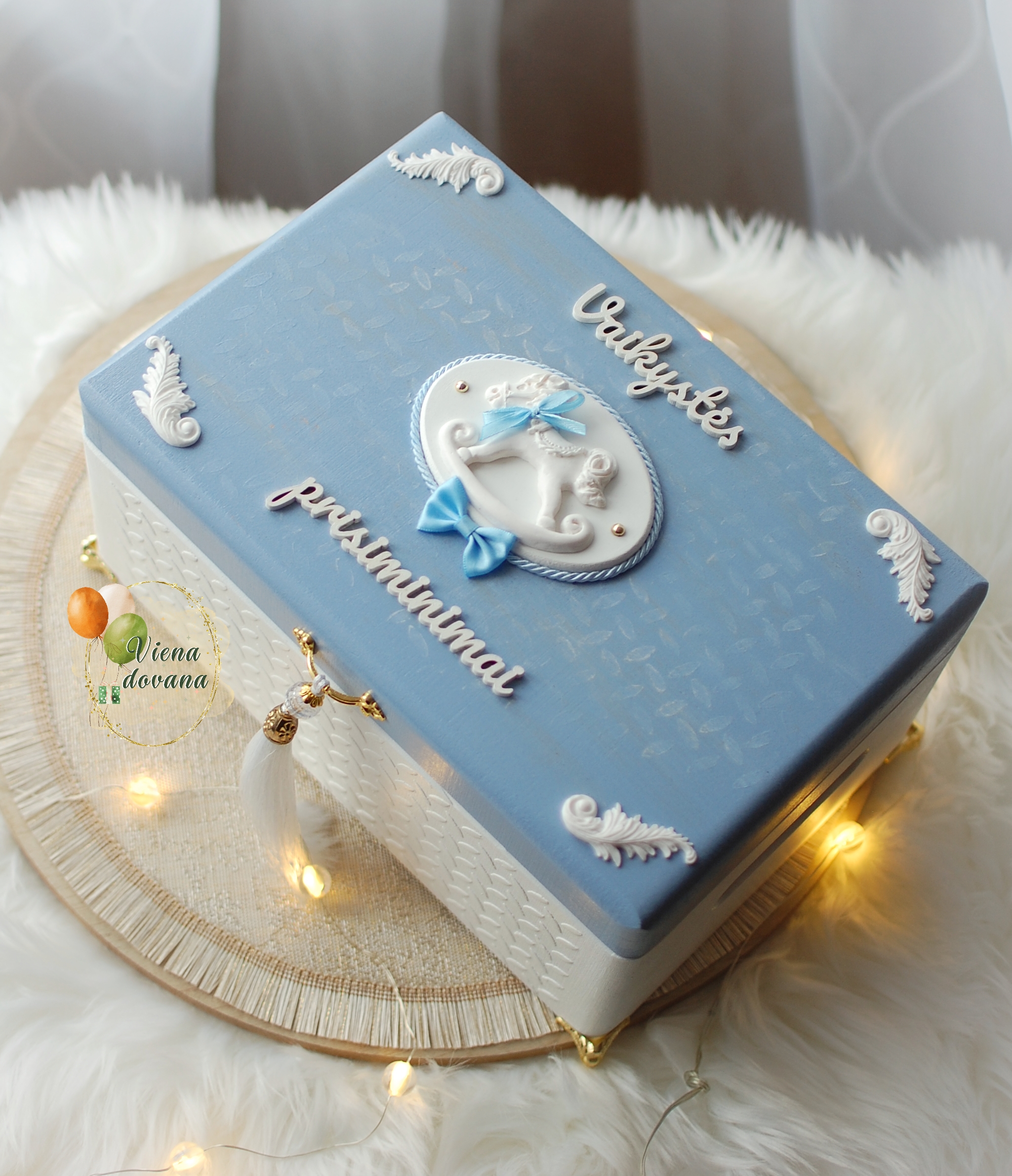 Dekupažo technika dekoruota medinė daiktadėžė. Dėžutė puošta medinėmis ir polimerinio molio dėtalėmis, aukso spalvos metalinėmis kojelėmis.