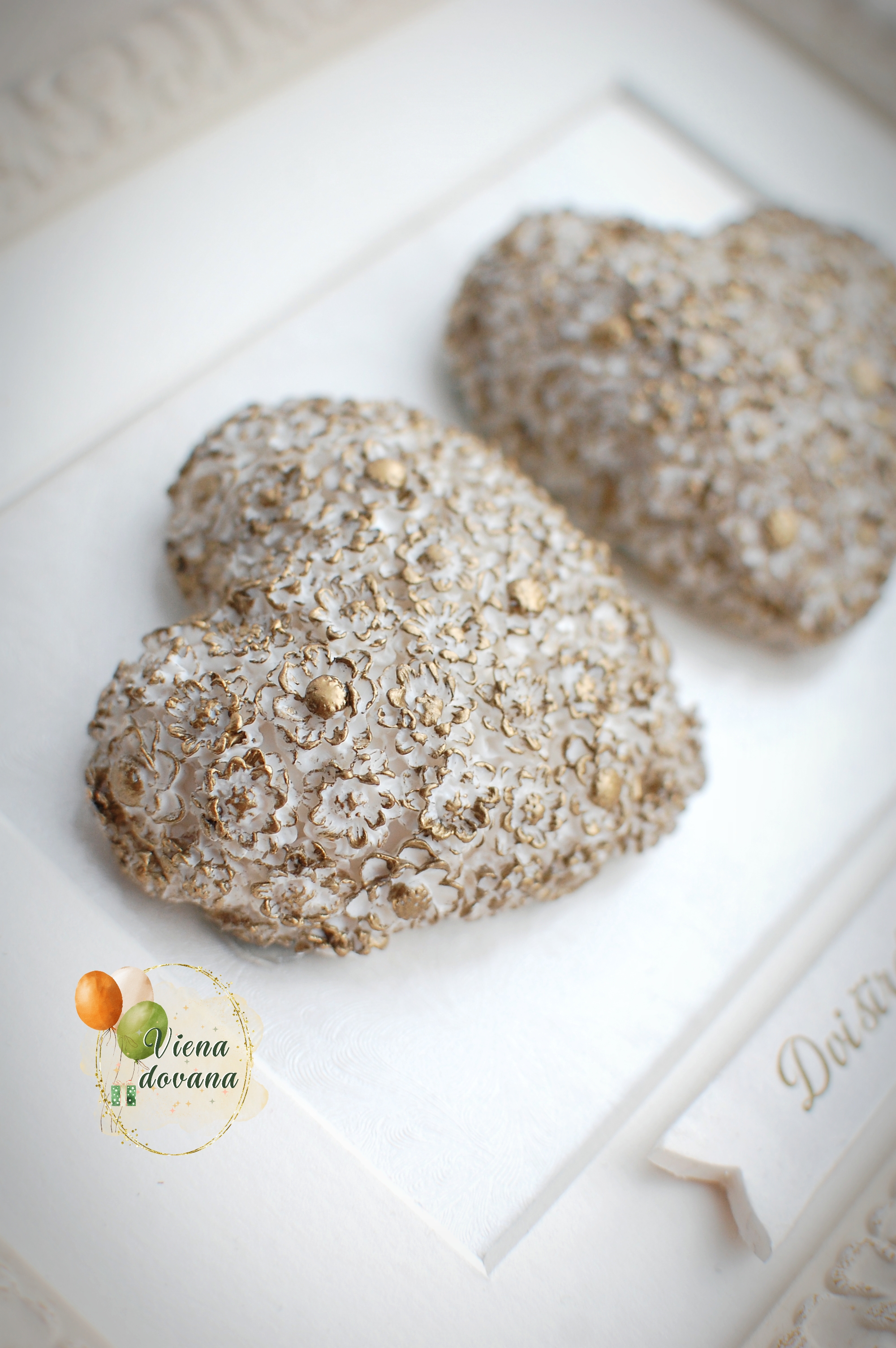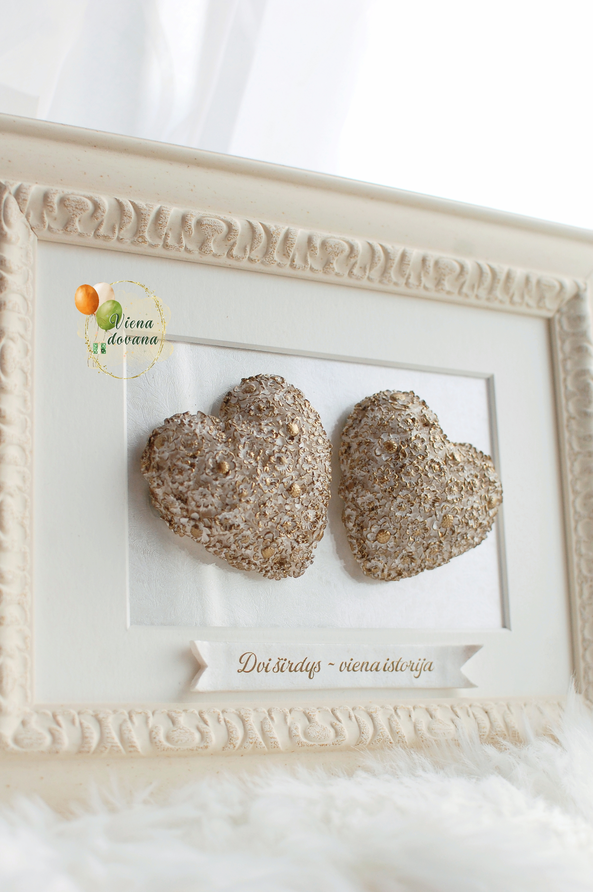 Šis rankų darbo rėmelis gimė iš daugybės mažų, kruopščiai lipdytų ir paauksuotų gėlių – kiekviena primena apie mažas kasdienes pastangas, kurios kuria didelę meilę.